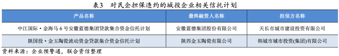 部分違約城投企業由于對民企擔保而發生違約事件(如下表),由于民企發生違約事件,但擔保方拒不履行代償職責或延期代償,從而導致城投企業關聯發生違約事件。但是此類違約的信托計劃整體數量不多。