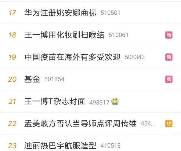 打開微博一看,果不其然,微博熱搜第20名。環顧基金上下,是王一博、孟美岐、華為小公主姚安娜等流量人物。