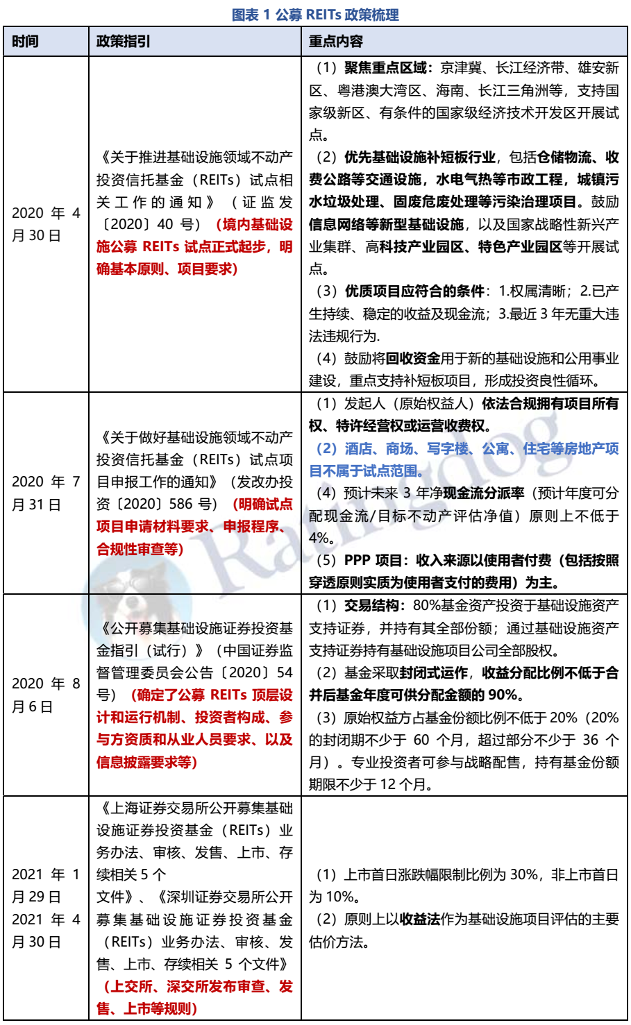出于盤活存量資產,打通投融資渠道的目的,我國公募REITs從基礎設施領域開始。2020年40號文件標志境內公募REITs產品試點正式開始,后續緊跟一系列政策文件,完成了整個政策框架和業務規則的制訂。