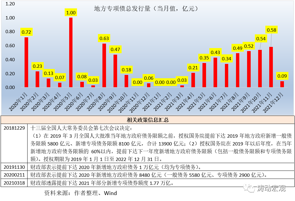 中央經(jīng)濟(jì)工作會(huì)議提及“適當(dāng)超前開(kāi)展基礎(chǔ)設(shè)施投資”(參見(jiàn)2021年中央經(jīng)濟(jì)工作會(huì)議釋放十大重磅信號(hào)),符合穩(wěn)增長(zhǎng)與保就業(yè)的政策導(dǎo)向,也意味著專(zhuān)項(xiàng)債將會(huì)在2022年發(fā)力。為此,2021年12月16日,財(cái)政部副部長(zhǎng)許宏才、預(yù)算司負(fù)責(zé)人兼政府債務(wù)研究和評(píng)估中心主任宋其超出席政策例行吹風(fēng)會(huì),有以下幾個(gè)信號(hào)值得關(guān)注: