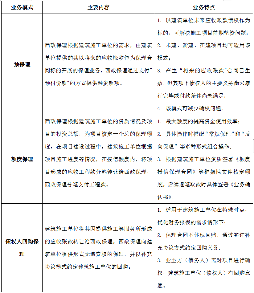 對于國央企建筑施工單位的供應(yīng)鏈保理業(yè)務(wù),目前主要的業(yè)務(wù)模式包括以國央企建筑施工單位未來應(yīng)收賬款為保理合同標的的預(yù)保理業(yè)務(wù);給予國央企建筑施工單位授信額度的額度保理;債權(quán)人回購保理及業(yè)主貼息保理模式。具體如下: