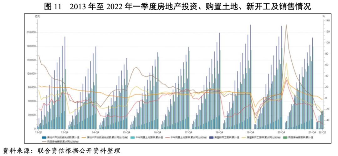 2021年,全國完成房地產開發投資147602.08億元,同比增長4.40%,增速較上年下降2.60個百分點,增速低于固定資產投資整體增速0.50個百分點,創2016年以來增速新低。2022年一季度,房地產開發投資增速進一步下降至0.70%,增速低于固定資產投資整體增速8.60個百分點,房地產開發投資對固定資產投資的拉動作用明顯弱化。同時,房地產新開工面積增速出現負增長,2021年和2022年一季度增速分別為-11.40%和-17.50%,增速進一步下降。從拿地情況來看,2021年購置土地面積同比下降15.50%,2022年一季度同比下降41.80%,土地行情繼續低迷。從銷售情況來看,2021年商品房銷售面積和銷售額分別同比增長1.90%和4.80%,增速較上年分別下降0.7個百分點和3.9個百分點,2022年一季度商品房銷售面積和銷售額增速均由正轉負,增速分別為-13.80%和-22.70%。