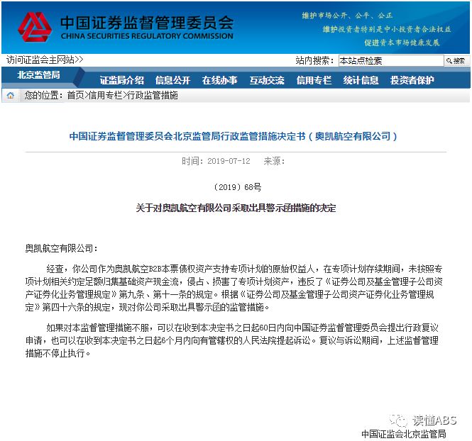 北京證監(jiān)局對奧凱航空出具ABS警示函,未足額歸集現(xiàn)金流,侵占損害專項計劃資產(chǎn)!
