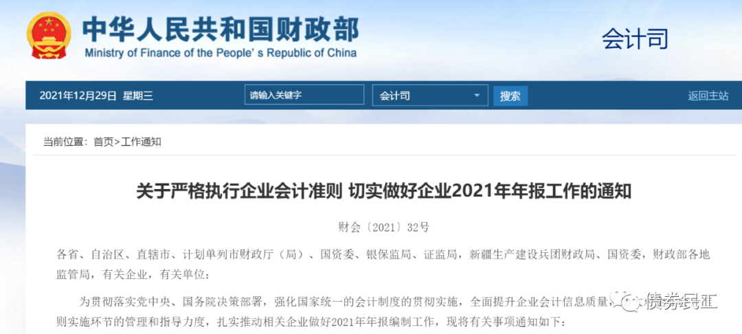 財政部于2021年12月29日披露了與國務院國資委、中國銀保監會和證監會四部委于聯合制定的《關于嚴格執行企業會計準則 切實做好企業2021年年報工作的通知》(財會[2021]32號),切實強調要做好2021年年報工作。