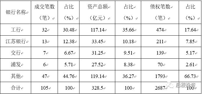 整年完成5次以上交易的銀行僅有4家,且高度集中在工行。這表明了銀行端出讓不良資產的分散。