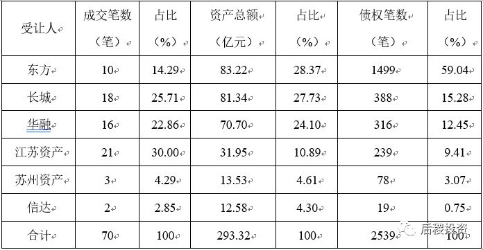在該轉讓類型中,資產總額最大的交易的轉讓人為信達江蘇分公司,受讓人為東方江蘇分公司,資產總額28.76億元,涉及56筆債權。第二大的交易轉讓方仍為信達江蘇分公司,受讓人為長城江蘇分公司,資產總額13.21億元,涉及18筆債權。其余交易是資產總額均在6億元以下。