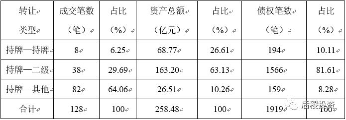 本轉讓類型共發生兩筆交易,在轉讓人為無錫和平健康投資有限公司、受讓人分別為黑龍江國投穗甬資產管理有限公司的交易中,資產總額為1.75億元,涉及債權2筆。在轉讓人合肥龍盛建設工程有限公司、受讓人華滬銀奧的交易中,資產總額1.74億元,涉及債權1筆。
