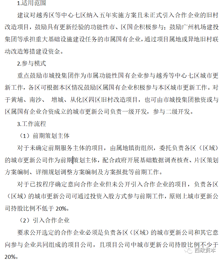 自8月10日發(fā)布上述《通知》的征求意見稿后,廣州市住建局《關于審議鼓勵功能性國企參與城市更新改造項目有關工作的請示》在各大媒體流傳開來,其中文件中提到的“重點鼓勵市城投集團作為市屬功能性國有企業(yè)參與越秀等中心七區(qū)城市更新工作”一度讓市場認為城市更新將全面進入國企主導的時代。