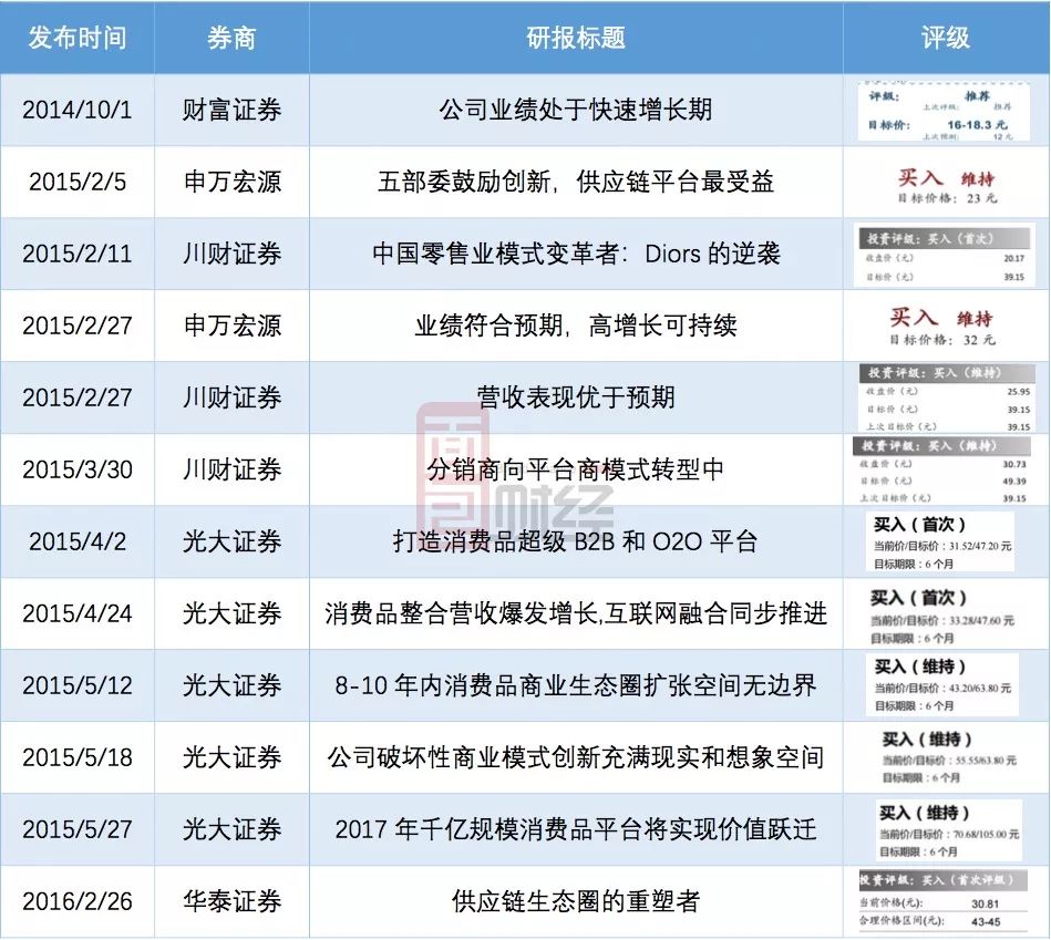 2013年,怡亞通的“深度供應鏈業務”進入快速發展期,公司開始被多家券商和機構熱捧。進入2015年前后,多家券商更是頻發研報,輪番力推。粗略整理: