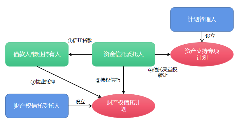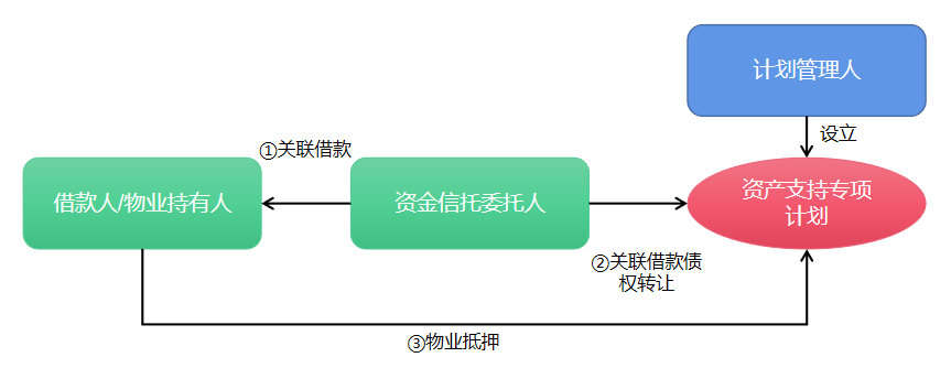 結構概述:在該模式下,原始權益人通過委托貸款銀行向借款人/物業持有人發放委托貸款,享有委托貸款債權,同時物業持有人將物業抵押給委貸銀行;計劃管理人設立專項資產支持計劃募集資金向原始權益人購買其持有的委托貸款債權。代表性案例:深圳益田假日廣場資產支持專項計劃