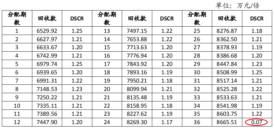 以“北京城市副中心投資建設集團有限公司2019年度第一期資產支持票據”為例,最后一期回收款對優先級證券的應付本息覆蓋倍數僅有0.07倍,可以推測,最后一期的優先級證券本金明顯較大。聯合評級披露,本交易優先級票據的到期本息償付將依賴于發起機構的再融資能力或抵押物處置變現價值,故聯合資信對于本交易 DSCR 測算不考慮最后年份。
