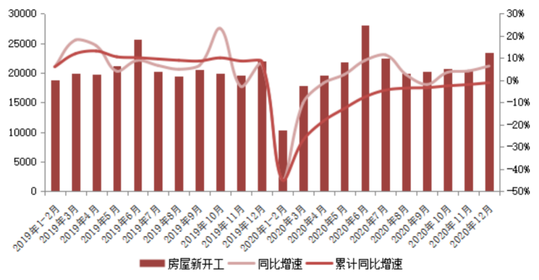 2020年房企房屋新開工面積在“三條紅線”出臺后便相應(yīng)止升回落。下半年新房市場銷售表現(xiàn)不及預(yù)期使得房企對未來預(yù)期看淡。同時融資收緊下房企資金問題短期內(nèi)難以發(fā)生根本轉(zhuǎn)變,房企對開工進度與施工強度的抉擇將受到持續(xù)影響。由于2020年房企土地購置面積依舊呈負增長,因此預(yù)計2021年可待開發(fā)土地規(guī)模有限,將拖累新開工指標,2021年新開工面積規(guī)模將繼續(xù)低位,但相比于2020年同比有望正增長,主要由于2020年規(guī)模較低且負增長,前值較低。