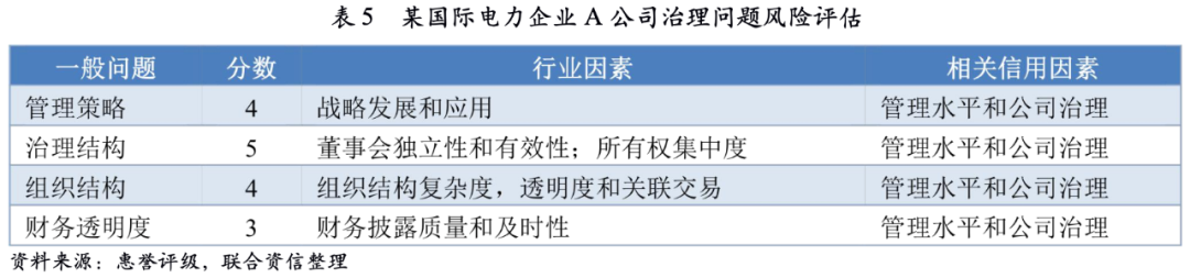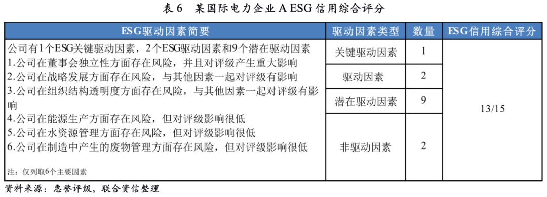 惠譽評級結(jié)合環(huán)境、社會和公司治理三大方面對某國際電力企業(yè)A進行風險評估,綜合匯總了ESG對企業(yè)A信用評級驅(qū)動因素并通過各個驅(qū)動因素數(shù)量得出ESG信用綜合評分。該ESG信用綜合評分表明ESG風險對企業(yè)A信用水平有很大影響,其中公司治理問題和信用評級關(guān)聯(lián)度最大,未來需重點關(guān)注。