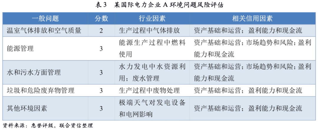 以某國際電力企業(yè)A為例,該電力企業(yè)涉及環(huán)境(E)方面一般問題有五個,分別為溫室氣體排放和空氣質(zhì)量、能源管理、水和污水方面管理、垃圾和危險廢棄物管理以及其他環(huán)境因素。在該公司所處的特定行業(yè)下,公司涉及環(huán)境方面因素相關(guān)度評分主要集中于分數(shù)3(如表3所示),即環(huán)境方面的問題與該公司信用評級相關(guān)度低,對企業(yè)信用評級的影響很小。比如對水和污水管理方面評分,主要考慮了公司在水力發(fā)電中水資源利用和廢水管理,該因素是公司ESG潛在評級因素,可能對公司資產(chǎn)基礎(chǔ)運營、盈利能力和現(xiàn)金流等相關(guān)信用因素產(chǎn)生一定影響。