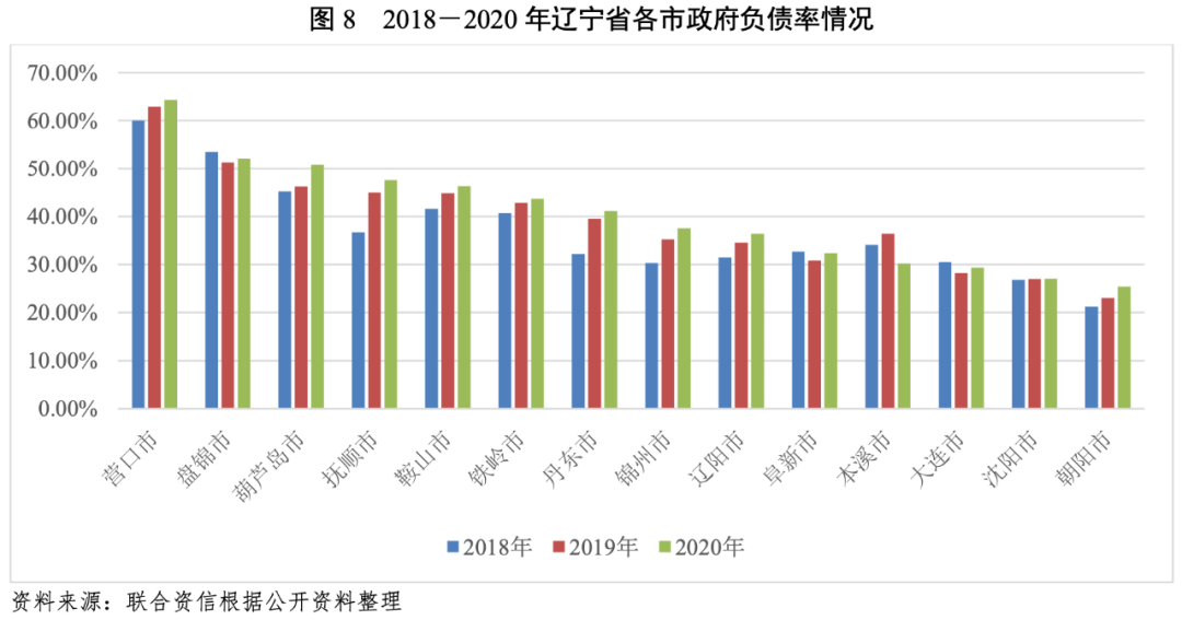 從各地區債務負擔來看,“發債城投企業全部債務+地方政府債務”/GDP較高的地級市分別為營口市、葫蘆島市、盤錦市和鞍山市,截至2020年底,上述地區該比值均超過50%;其他地市該比值在30%~50%之間。