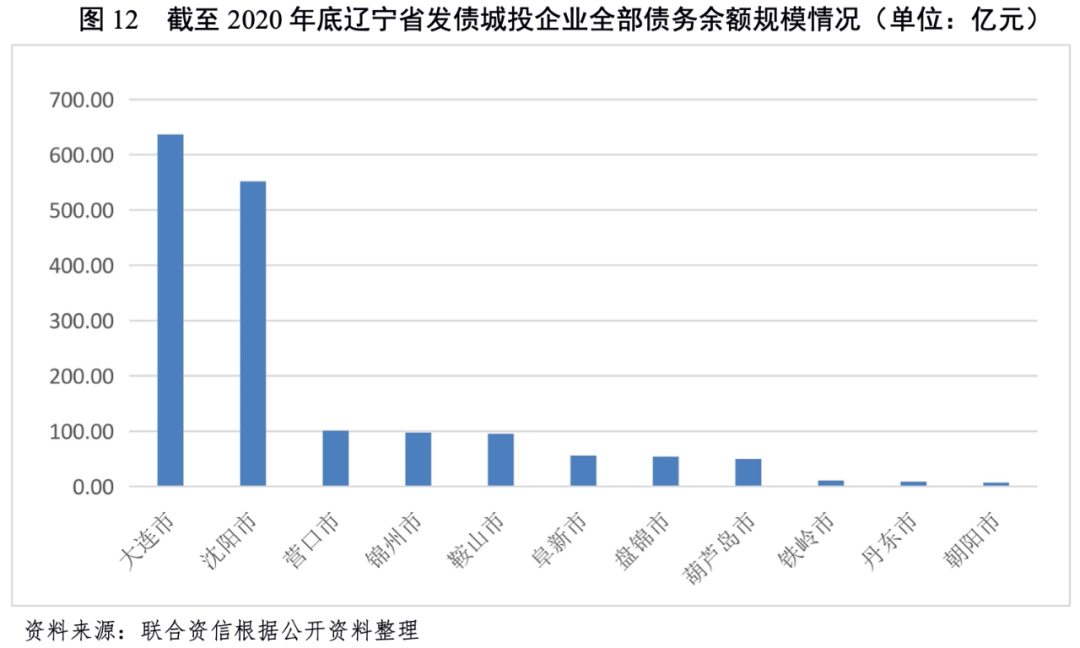 從遼寧省各地級市發債城投企業全部債務規模看,整體上,大連市和沈陽市發債城投企業全部債務規模較高,分別為637.08億元和551.63億元;其他地市發債城投企業全部債務規模均在101億元以下,其中朝陽市和丹東市發債城投企業全部債務規模最小,分別為6.83億元和8.38億元。