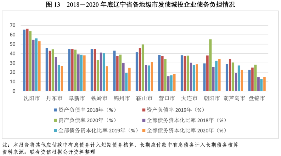 從發債城投企業全部債務與“發債城投企業全部債務+地方政府債務”的比值看,截至2020年底,遼寧省地級市發債城投企業全部債務占地區不完全統計債務的比重均較低,在30%以下。