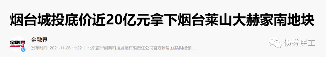 2021年11月26日,煙臺藍天投資開發(fā)集團有限公司的子公司煙臺市城市建設(shè)投資有限責任公司以19.67億元的價格摘得煙臺萊山大赫家南地塊總出讓面積為300畝的土地,土地性質(zhì)為住宅用地。