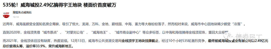 2021年12月13日,威海城市投資集團有限公司子公司威海城投置業(yè)有限公司以2.49億元的價格摘得金線頂宇王地塊總出讓面積為18686平米的土地,土地性質(zhì)為住宅用地。