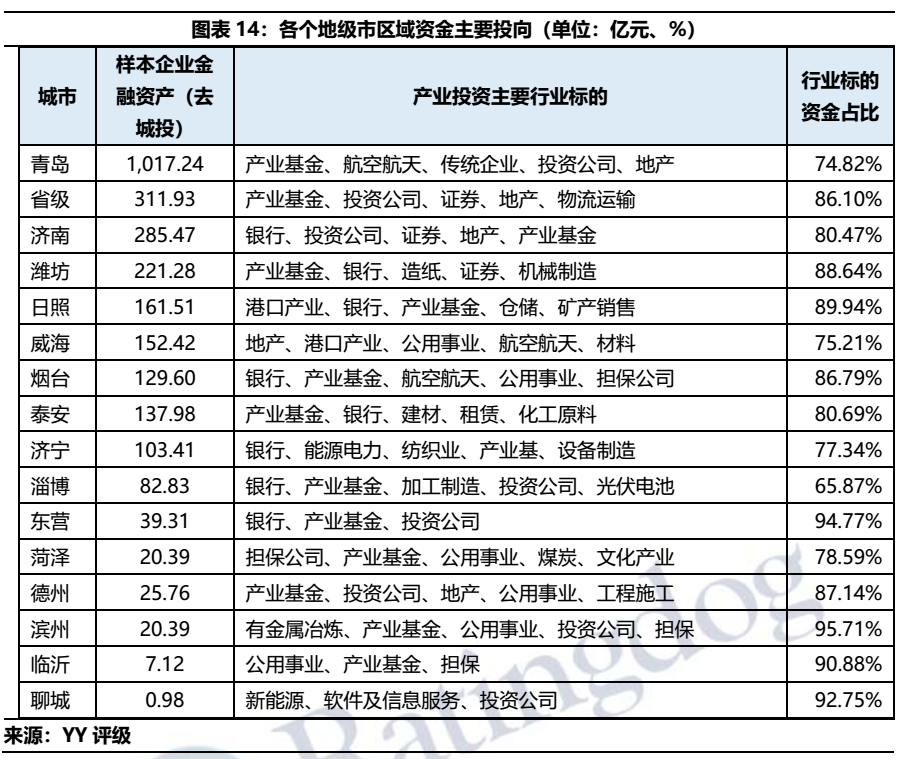 綜合來(lái)說(shuō),除去城投類投資,山東城投產(chǎn)業(yè)化的方向多為產(chǎn)業(yè)基金(主要投資標(biāo)的為信息技術(shù)、汽車和醫(yī)藥行業(yè))、銀行(約88.10%投向本土銀行)、地產(chǎn)、投資公司、港口產(chǎn)業(yè)、航空航天。
