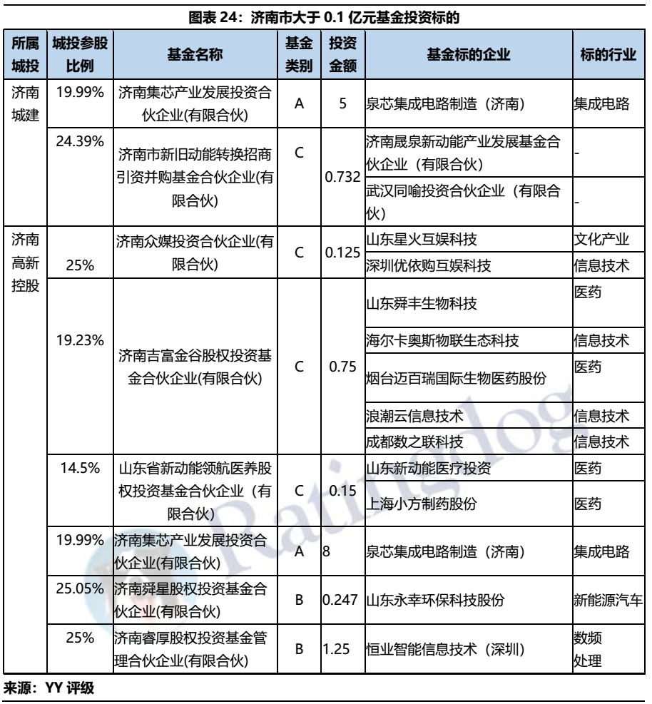 總體來(lái)看,山東城投偏好于產(chǎn)業(yè)基金、銀行、投資類公司的投資,上述標(biāo)的投資分別占去城投類投資總額的25.52%、13.29%和9.33%。分行政區(qū)域劃分來(lái)看,僅有國(guó)家級(jí)開發(fā)區(qū)投資最多為地產(chǎn)行業(yè),其余皆為產(chǎn)業(yè)基金。分地市級(jí)來(lái)看,產(chǎn)業(yè)基金投資占比第一的區(qū)域分別為青島、省級(jí)平臺(tái)、濰坊、泰安和德州。銀行投資在投資金額中占比最高的區(qū)域則是濟(jì)南、煙臺(tái)、濟(jì)寧、淄博和東營(yíng)。
