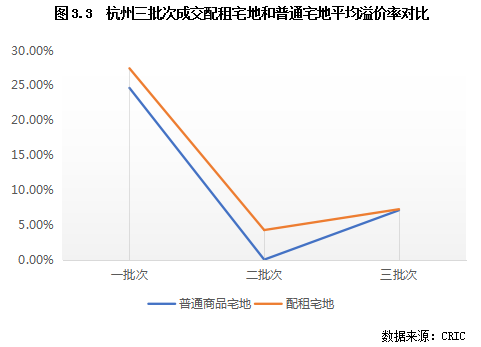 從上節(jié)可以看出,配租宅地往往位于中心城區(qū)及郊區(qū)的熱點片區(qū),而普通商品住宅用地則大多位于臨安等遠郊片區(qū)或為土地性質較為復雜的宅地,房企拿地意愿不高。因此,從成交溢價率來看,配租宅地的平均成交溢價率往往也高于普通商品住宅地塊,即使在熱度明顯下降的第二批亦是如此。