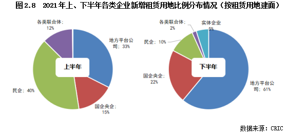 而進入下半年以后,民企投資態(tài)度發(fā)生大幅轉變,不再積極拿地,即使拿地也不再積極競拍至需要競配建的輪次,因此新增租賃用地建面大幅下降,占比下滑至10%;反之國企央企、地方平臺公司新增租賃用地的比例大幅提升,國企央企提升至22%,地方平臺公司更是提升至61%,成為各地新建租賃用房的主力。