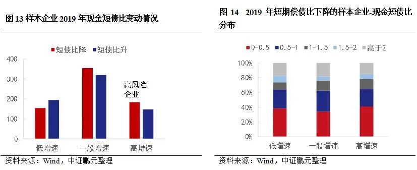 2019年有55%的高增速企業現金短債出現下降(一般增速企業有53%,低增速企業有44%),即高風險企業樣本組。在現金短債比出現下降的主體中,高增速企業中30%的企業現金短債比降幅在50%及以上(一般增速企業有21%,低增速企業有21%)。從現金短債比的分布看,高增速企業中41%的企業現金短債比在0.5以下(低增速企業38%,一般增速企業34%),各類型企業中均有超過60%的主體現金短債比在1以下。