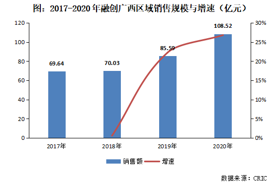近年來(lái),隨著廣西房地產(chǎn)市場(chǎng)打開,各大品牌房企競(jìng)相入駐,截至目前TOP20中僅有個(gè)別房企未有項(xiàng)目布局。從克而瑞排行榜來(lái)看,2020年碧桂園、龍光、陽(yáng)光城、萬(wàn)科、恒大、融創(chuàng)、金科等外來(lái)品牌房企占據(jù)廣西市場(chǎng)第一陣營(yíng),競(jìng)爭(zhēng)激烈。融創(chuàng)自2016年首進(jìn)廣西,也有意加速市場(chǎng)擴(kuò)張,規(guī)模增速不斷提升,2020年廣西區(qū)域銷售額突破百億,達(dá)到108.5億元,位列房企第8位。