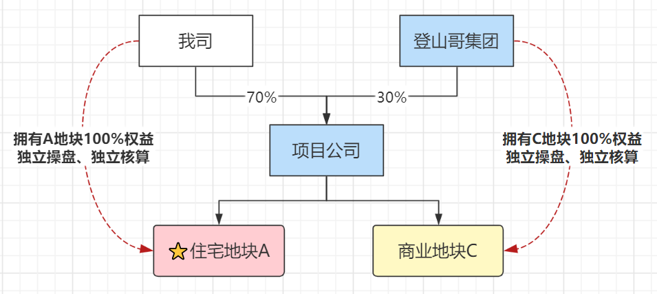 模式2:分地塊分帳套獨(dú)立核算。即收購(gòu)部分股權(quán),但雙方約定“該部分股權(quán)”對(duì)應(yīng)“目標(biāo)地塊100%開發(fā)收益權(quán)”,和原股東之間采用“分帳套方式獨(dú)立核算、獨(dú)立投入、操盤,獨(dú)立享有收益、承擔(dān)風(fēng)險(xiǎn)”。