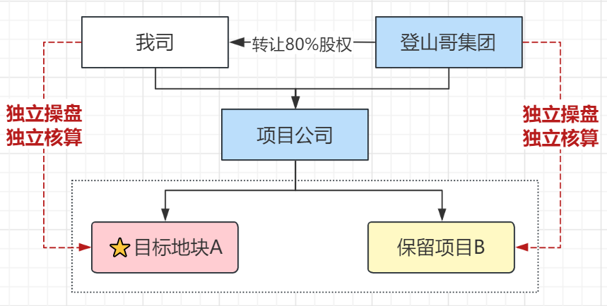 即收購(gòu)目標(biāo)公司80%的股權(quán),對(duì)應(yīng)二期地塊的開發(fā)權(quán)益,雙方分賬套獨(dú)立核算。目標(biāo)公司其余資產(chǎn)權(quán)益仍歸登山哥公司所有,目標(biāo)地塊與保留地塊的成本、稅費(fèi)、收益、債權(quán)債務(wù)按照各自區(qū)域獨(dú)立核算并分別成立專屬資金賬戶負(fù)責(zé)專屬記賬及獨(dú)立收、支。