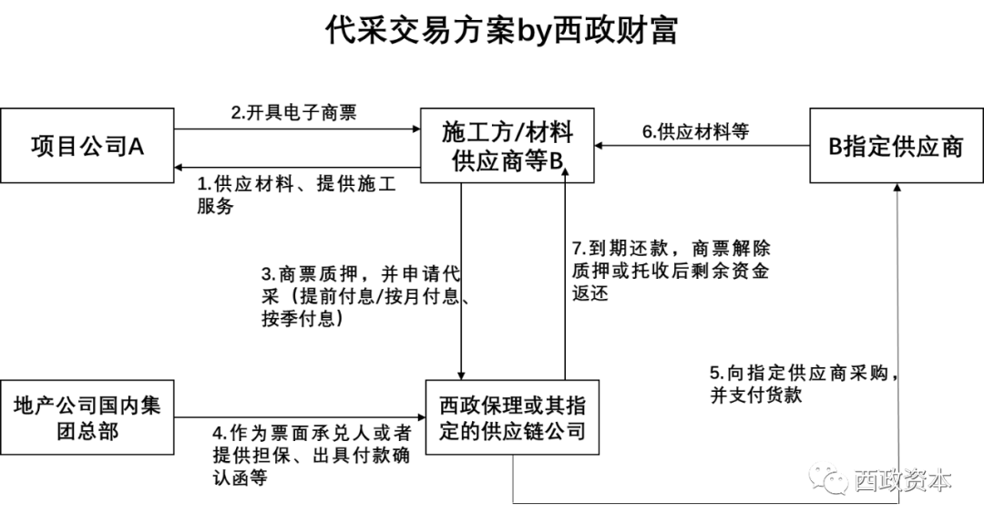 根據(jù)前文提到的邏輯,如果開發(fā)商的交易對手(比如總包方、材料供應商等)本身能解決融資的問題,那開發(fā)商就不需要太依賴自身的融資去解決材料和工程款的應付問題(比如直接開商票進行支付即可)由此就可以大量減少有息負債的需求,而且總包方、材料供應商的融資成本較低的情況下一定程度上還可以總體拉低房企的融資成本(假設總包方、材料供應商是房企可控制的主體)。以下以我們目前開展較多的代采業(yè)務為例簡單舉例說明。