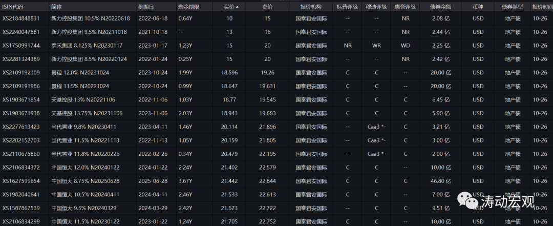 1、近期地產(chǎn)企業(yè)美元債遭受重創(chuàng),下跌幅度較大,已經(jīng)引起市場恐慌。例如,新力控股與恒大的美元債價格已分別跌至15元和20元左右,花樣年的美元債已分別跌至30元左右等。