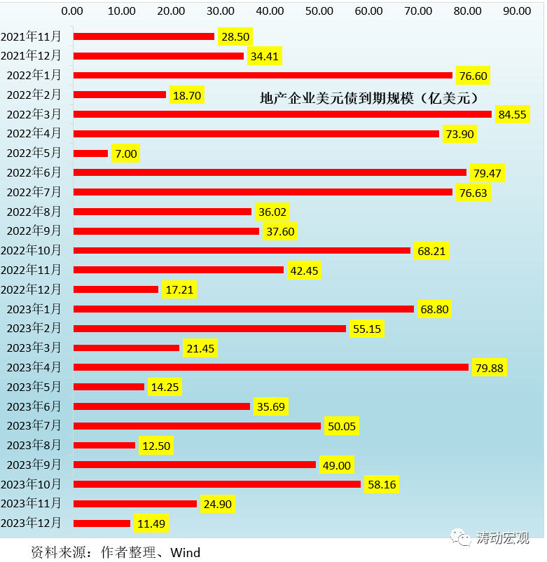 2023年全年將有138只地產(chǎn)企業(yè)美元債到期,到期規(guī)模合計達到480億美元左右。其中,一至四季度分別到期145億美元、130億美元、112億美元和95億美元,到期數(shù)量分別達到38只、38只、33只和29只。