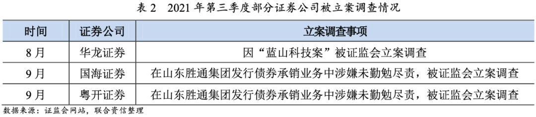 2021年第三季度,華龍證券、國海證券、粵開證券等證券公司因投行業(yè)務(wù)中未勤勉盡責(zé)等原因被證監(jiān)會立案調(diào)查,證券公司監(jiān)管處罰頻次較2季度有所減少,多家證券公司因營業(yè)部內(nèi)控等問題受到監(jiān)管措施。