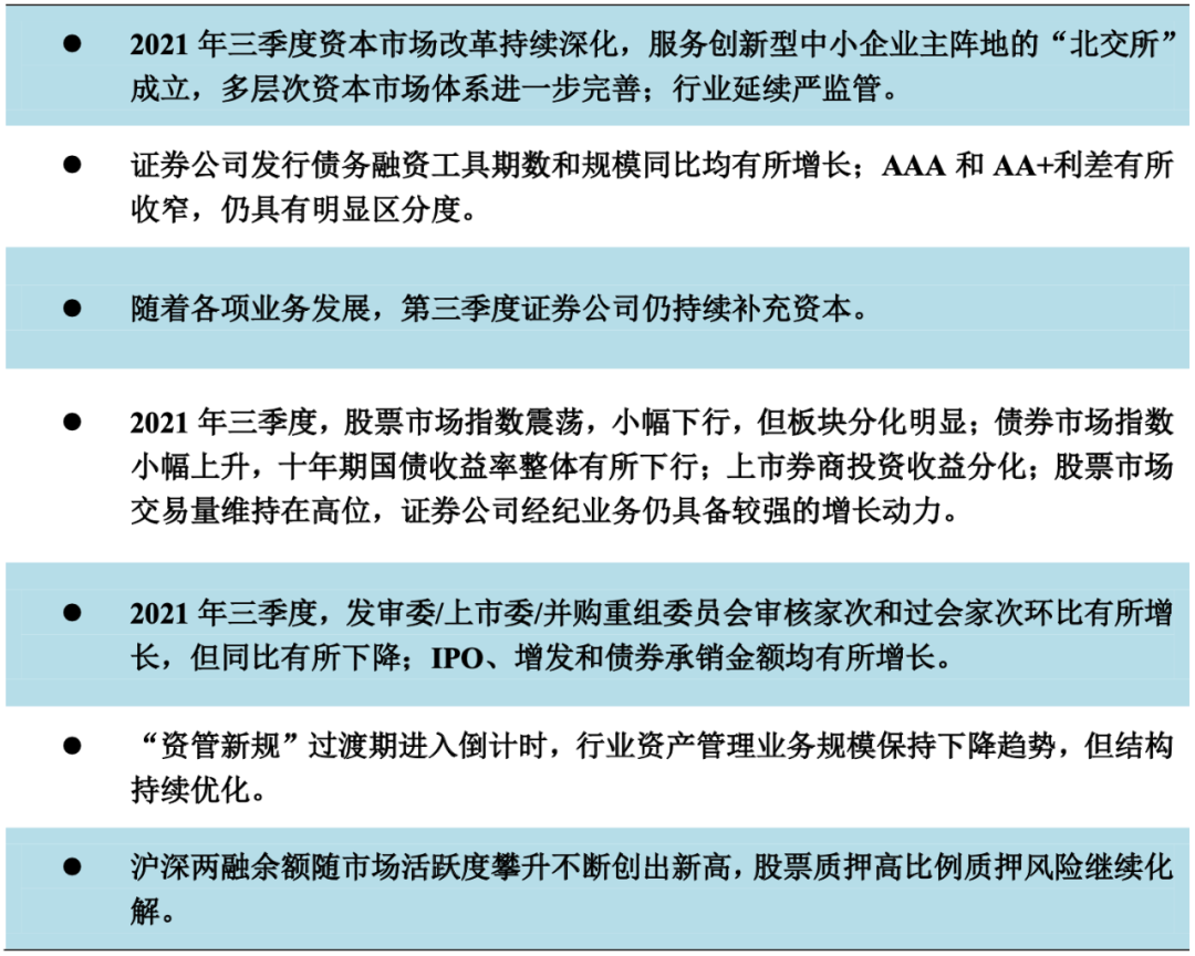 2021年三季度,國內(nèi)股票市場行情波動加大,呈結(jié)構(gòu)性行情,但股票市場交易量維持在高位,兩融業(yè)務(wù)實現(xiàn)較好發(fā)展;投資銀行類項目過會率環(huán)比有所下降,IPO、增發(fā)和債券承銷金額同比均有所增長;資產(chǎn)管理業(yè)務(wù)結(jié)構(gòu)持續(xù)優(yōu)化,股票質(zhì)押業(yè)務(wù)風(fēng)險逐步化解。