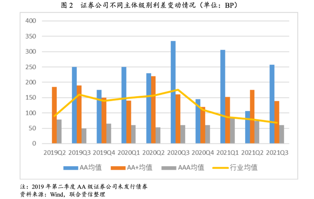 2021年第三季度,證券公司發(fā)行利差有所收窄,其中主體評級為AAA和AA+證券公司發(fā)行利差均值降幅較大,AA級證券公司利差均值有所上升;行業(yè)利差均值68.34BP,環(huán)比下降10.99BP;AAA證券公司平均利差低于AA+利差78.76BP,差額環(huán)比下降21.97BP。