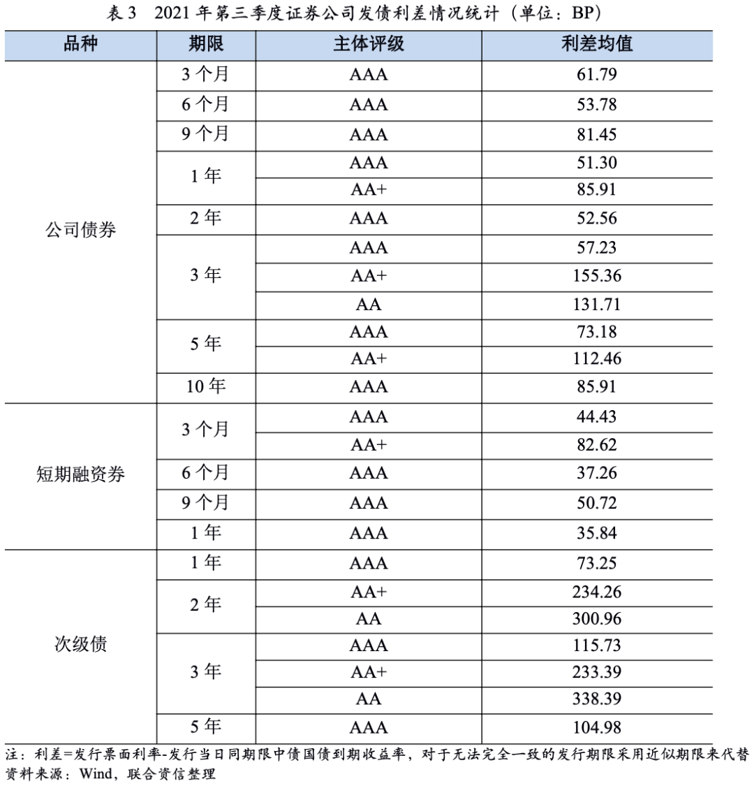 2021年第三季度,證券公司發(fā)行利差均值68.34BP,較二季度下降10.99個BP。證券公司發(fā)行不同債券品種在不同主體評級和不同期限上均具有明顯區(qū)分度,AAA主體發(fā)行利率顯著低于AA+級證券公司,AAA級證券公司發(fā)行1年期和3年期公司債券利差均值在50.30BP和57.23BP,遠(yuǎn)低于AA+證券公司發(fā)行同等期限公司債券利率,AA+與AA級券商發(fā)行3年期公司債券利差呈與評級等級倒掛狀態(tài),主要系A(chǔ)A級證券公司3年期公司債券具有擔(dān)保所致。AA+證券公司發(fā)行的5年期公司債券利差略低于同評級下的3年期公司債券,但考慮到三季度內(nèi)AA+證券公司僅發(fā)行了二期5年期限的公司債,該數(shù)據(jù)沒有可比性。AAA證券公司發(fā)行3個月期限短期融資券利差均值在44.43BP,AA+證券公司為82.62BP。AAA證券公司發(fā)行各年期次級債利差均低于AA+及AA級證券公司發(fā)行同期限的次級債券利差。綜上所述,AAA證券公司在融資成本方面優(yōu)勢明顯。