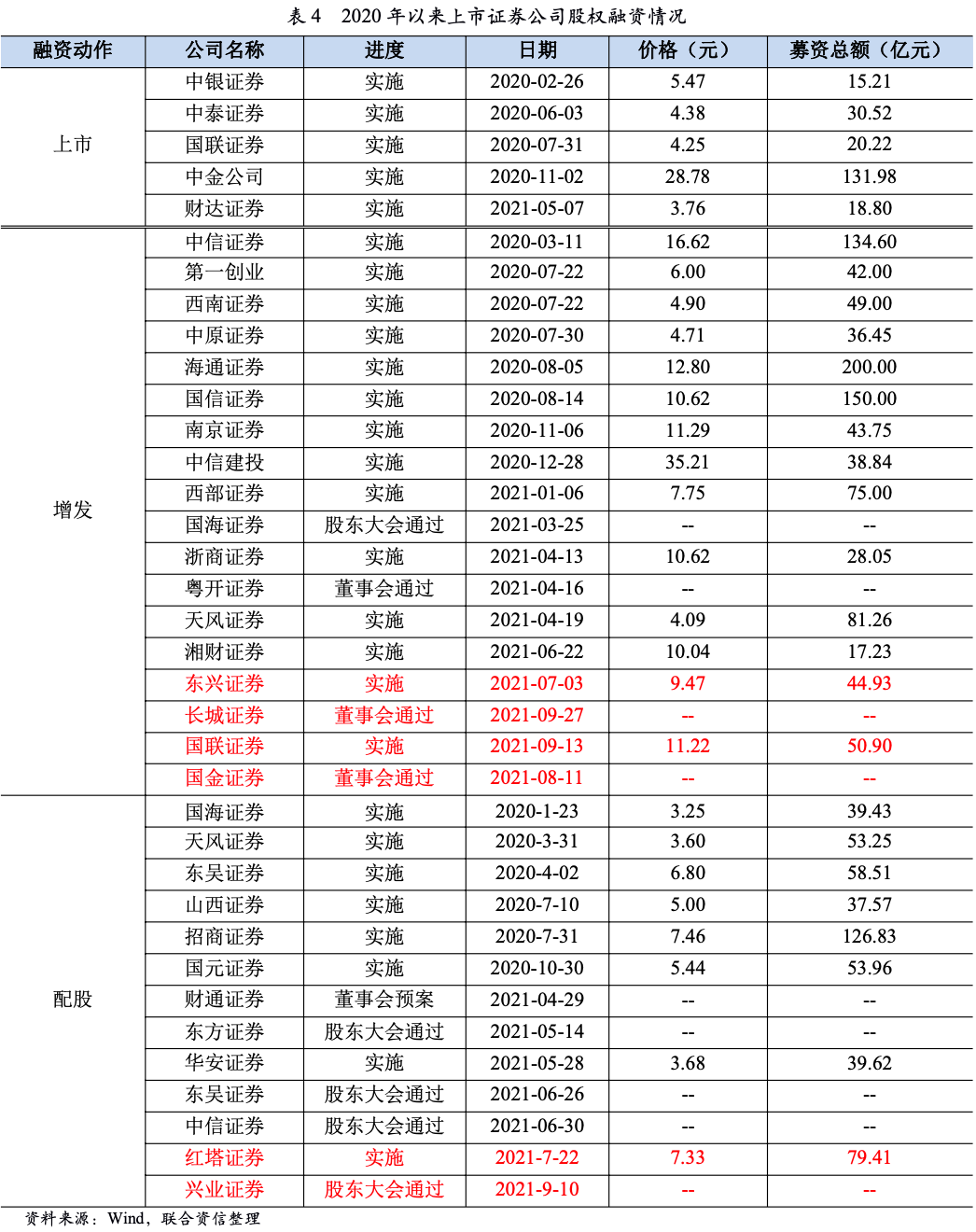 2021年第三季度,紅塔證券配股計劃進入實施階段,募集資金79.41億元;東興證券和國聯(lián)證券的增發(fā)方案已經(jīng)進入實施階段,募集資金分別為44.93億元和50.90億元,預(yù)計隨著證券公司各項業(yè)務(wù)發(fā)展,資本補充趨勢將延續(xù)。