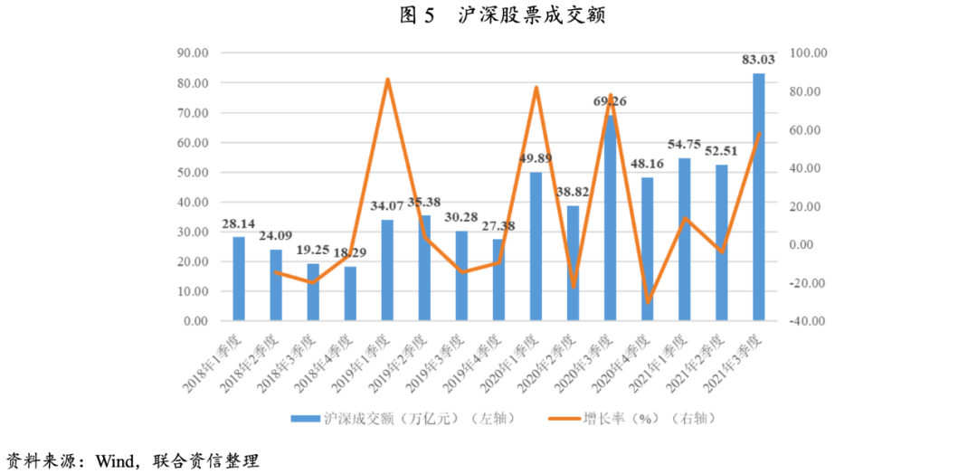 自2020年三季度股市交易活躍程度達到階段性峰值以來,股市交易的活躍程度有所下降,但一直維持在歷史的相對高位,滬深兩市成交額基本穩(wěn)定在50萬億元規(guī)模上下。2021年三季度,滬深兩市成交量83.03萬億元,環(huán)比增長58.12%,同比增長19.88%;市場交投活躍程度大幅攀升,滬深兩市成交額創(chuàng)歷史新高,整體看,經(jīng)紀(jì)業(yè)務(wù)具備較強增長動力,有力支撐證券公司收入增長。