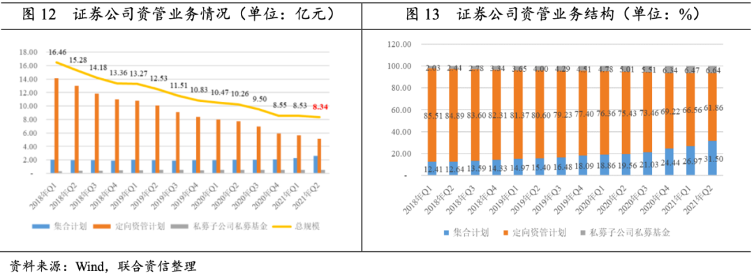資產(chǎn)管理業(yè)務(wù)規(guī)模保持下降趨勢,集合計劃占比有所增加。“資管新規(guī)”過渡期進入“倒計時”,截至2021年6月末,證券公司資管業(yè)務(wù)總規(guī)模延續(xù)下降態(tài)勢,主要系定向資管計劃的壓降;集合計劃和私募基金管理規(guī)模穩(wěn)步增長;證券公司資管業(yè)務(wù)仍以定向資管業(yè)務(wù)為主,但占比持續(xù)下降,集合計劃占比繼續(xù)提升,私募基金占比雖有所增長但占比仍較小,資產(chǎn)管理業(yè)務(wù)整體結(jié)構(gòu)有所優(yōu)化。
