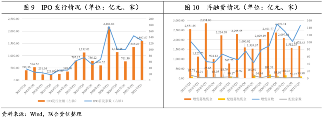 IPO發(fā)行和增發(fā)金額穩(wěn)步增加,股權(quán)項目募資規(guī)模環(huán)比小幅增長。2021年三季度,各類股權(quán)類項目募資總額環(huán)比增長3.56%,主要系IPO發(fā)行金額和增發(fā)募集資金規(guī)模的增長(分別環(huán)比增長18.50%和6.09%)。IPO和增發(fā)仍為股權(quán)類項目募集資金的主要方式,2021年三季度,通過上述兩種方式募集資金的金額分別1597.57億元和1678.43億元,占募資總額的比重分別為38.45%和40.39%。