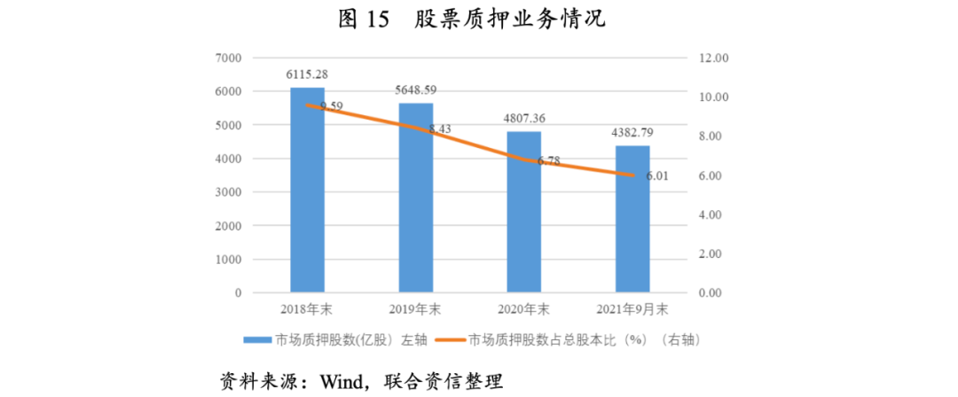 質(zhì)押股份市值以及質(zhì)押股數(shù)占總股本比重持續(xù)下降,同時證券公司大規(guī)模計提減值準(zhǔn)備,股票質(zhì)押高比例質(zhì)押風(fēng)險進一步緩解。截至2021年9月末,股票質(zhì)押市場質(zhì)押股數(shù)占總股本比6.01%,較二季度末下降0.36個百分點;市場質(zhì)押股份市值合計41846.22億元,較二季度末下降2.48%。控股股東(按第一大股東口徑統(tǒng)計,下同)持股質(zhì)押比例超過80%的上市公司家數(shù)293家,較二季度末減少15家,高比例質(zhì)押風(fēng)險進一步緩解。