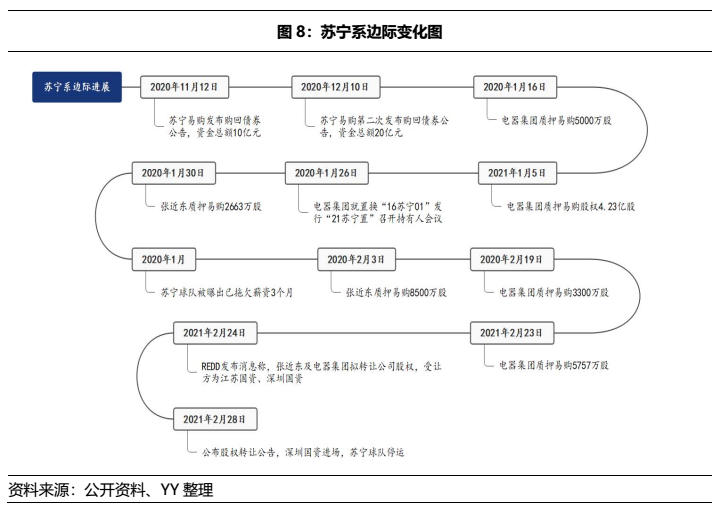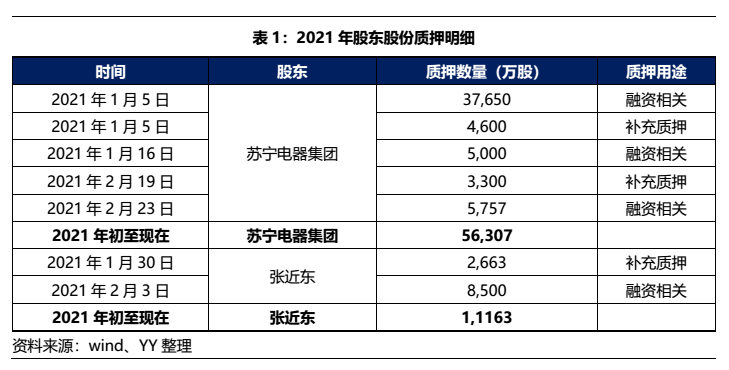 從時(shí)間線及主體來看,2021年以來電器集團(tuán)共質(zhì)押了近5.63億股,張近東共質(zhì)押了1.12億股,主要用于補(bǔ)充質(zhì)押和融資相關(guān)。截至2021年2月23日,蘇寧電器集團(tuán)持有公司19.88%的股份,共計(jì)質(zhì)押8.97億股,占所持股份的48.47%;截至2021年2月3日,張近東及一致行動(dòng)人蘇寧控股集團(tuán)有限公司合計(jì)持有公司24.94%股份,共計(jì)質(zhì)押4.11億股,占所持股份的17.72%。
