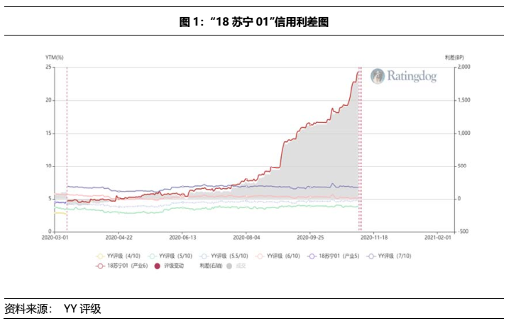 2020年8月初,蘇寧易購相關(guān)債券遭遇砸盤,利差逐漸走闊,信仰明顯處于波動(dòng)狀態(tài),市場的擔(dān)憂和價(jià)格的相互印證,進(jìn)入負(fù)循環(huán)階段。
