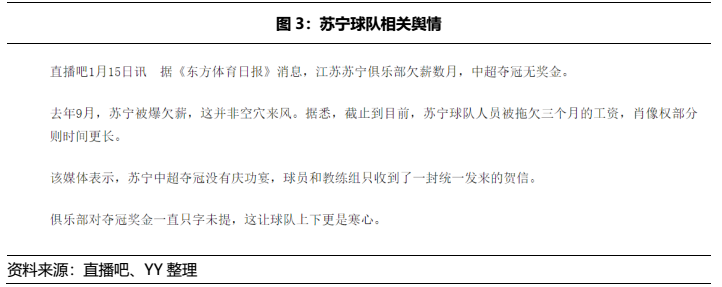 同天,蘇寧球隊(duì)發(fā)布了停運(yùn)的公告,追溯1月的輿情可以發(fā)現(xiàn),之前蘇寧球隊(duì)就爆出欠薪三個(gè)月的消息,也印證了之前整個(gè)蘇寧系流動(dòng)性的緊缺,另外此番剝離球隊(duì),也有回歸主業(yè),剝離無關(guān)副業(yè)的決心。