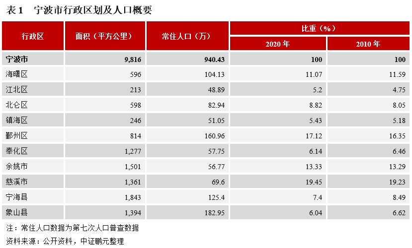 (1)行政區(qū)劃:寧波是副省級(jí)市,區(qū)域陸域總面積9,816平方公里,海岸線總長(zhǎng)1,678公里。下轄6個(gè)區(qū)、2個(gè)縣,同時(shí)代管2個(gè)縣級(jí)市。2020年“七普”數(shù)據(jù)顯示,寧波市常住人口為940.43萬(wàn)人,相較2010年增加179.86萬(wàn)人,是浙江省人口第三大城市,次于杭州的1,193.60萬(wàn)人和溫州的957.29萬(wàn)人;同時(shí),受益于發(fā)達(dá)的經(jīng)濟(jì)發(fā)展水平、旺盛的發(fā)展活力和友好的落戶政策,寧波近年來(lái)始終保持著較強(qiáng)的人口吸引力,2020年實(shí)現(xiàn)人口凈流入約86.2萬(wàn)。