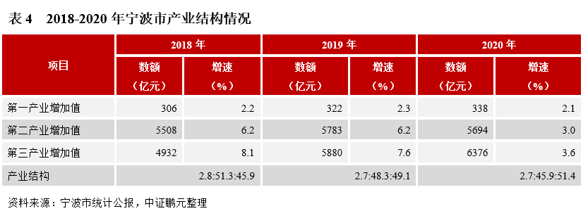 寧波市是典型的外向型民營(yíng)經(jīng)濟(jì)驅(qū)動(dòng)型城市,以汽車制造業(yè)、電氣機(jī)械和器材制造業(yè)、化工、紡織等為支柱產(chǎn)業(yè)。同時(shí),近年來(lái)寧波市加快經(jīng)濟(jì)轉(zhuǎn)型升級(jí),發(fā)展起了以港口物流、文化旅游等為主的現(xiàn)代服務(wù)業(yè),受益于此2020年寧波市第三產(chǎn)業(yè)占比首次提升至50%以上(見表4)。