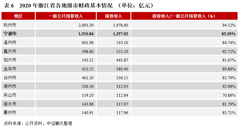 (3)財(cái)政實(shí)力:近年來(lái),寧波市財(cái)政收入穩(wěn)健增長(zhǎng),綜合財(cái)政實(shí)力在省內(nèi)僅次于杭州市。2020年,寧波出臺(tái)一系列助力復(fù)工復(fù)產(chǎn)政策以對(duì)沖疫情影響,其民營(yíng)外向型經(jīng)濟(jì)實(shí)現(xiàn)較快復(fù)蘇,帶動(dòng)稅收收入取得同比正增長(zhǎng),且稅收收入占比保持較高水平;2020年寧波樓市調(diào)控先揚(yáng)后抑,但同時(shí)繼續(xù)放寬落戶條件,居民購(gòu)房熱情高漲,全年商品房住宅量?jī)r(jià)齊升,土地出讓金同比大幅增長(zhǎng),較好緩解了疫情對(duì)政府性基金收入的拖累。