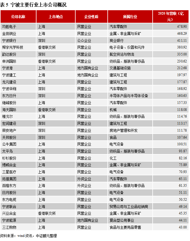 (2)產(chǎn)業(yè)結(jié)構(gòu):寧波市是典型的外向型民營(yíng)經(jīng)濟(jì)驅(qū)動(dòng)型城市, 以汽車制造、電氣機(jī)械和器材制造、化工、紡織等為支柱產(chǎn)業(yè);截至2021年10月末寧波市共有102家A股上市公司和12家香港上市公司,行業(yè)分布集中在汽車零部件、電氣設(shè)備、工業(yè)機(jī)械、化工、建筑業(yè)、家庭耐用消費(fèi)品等。